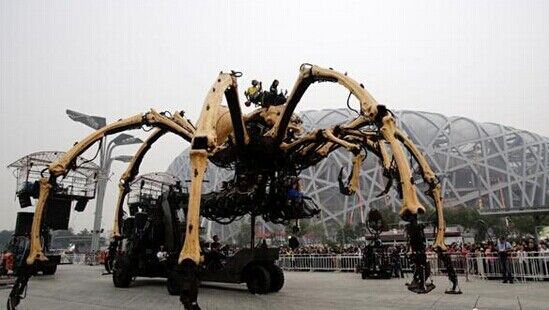 19時30分,全劇最終幕的表演準(zhǔn)時開始,“蜘蛛”在鞭炮聲中蘇醒并走向“龍馬”。只見它的腹部坐著10余名機(jī)械師,每人負(fù)責(zé)操縱“蜘蛛”身體的一部分,彼此配合默契,讓機(jī)械蜘蛛走起來與真蜘蛛步伐并無兩樣。
