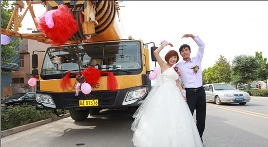 2011年,由10輛徐工吊車組成的“超強(qiáng)”迎親車隊(duì)在河北石家莊掀起了一股徐工熱。原來,為了給新娘一個(gè)驚喜,徐工重型石家莊一位大客戶別出心裁的用徐工吊車做婚車,由其親自駕駛價(jià)值逾千萬的徐工QAY220吊車,載著洋溢著滿臉幸福的新娘,緊隨其后的是四輛徐工QY25K吊車、兩輛徐工QY20G吊車、一輛徐工QY50K吊車,宛如一條黃色巨龍,浩浩蕩蕩的把新人接回。當(dāng)車隊(duì)到達(dá)酒店時(shí),酒店旁的兩輛吊車吊臂隨之揚(yáng)起,寫滿徐工集團(tuán)石家莊代表處對二位新人真摯祝福的條幅隨即展開,向世人展示了徐工對新人的祝福。