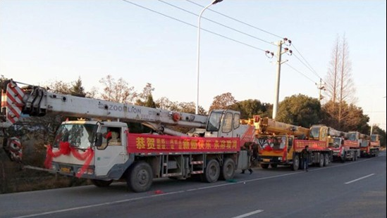 中聯(lián)吊車。四輛吊車組成的婚車隊(duì),行駛在路面上,浩浩蕩蕩,十分地拉風(fēng)和霸氣。現(xiàn)場的親朋好友發(fā)朋友圈戲稱:“最強(qiáng)婚車隊(duì),簡直任性。”
