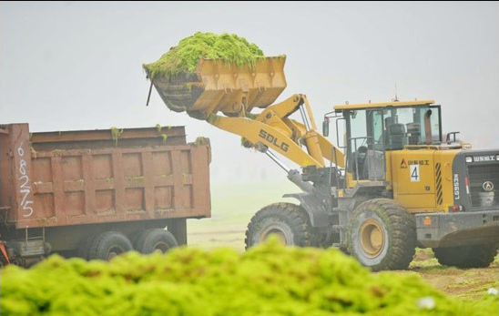 卡車等重型設(shè)備被派上了用場。在青島月亮灣沙灘,當(dāng)天隨海浪侵入沙灘的大量滸苔被裝載機(jī)推成大堆,然后運(yùn)送到挖掘機(jī)事先挖掘好的大坑中,用土掩埋。據(jù)了解,掩埋的滸苔腐爛后,還可以變成生物肥料,改變海岸邊土質(zhì),利于綠化和植樹造林。